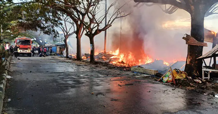 LENSATENGGARA.COM, MUNA – Kebakaran hebat melanda kawasan Pasar Laino di Kota Raha pada Minggu (26/4/2026) pagi, memicu kepanikan di kalangan warga dan pedagang yang tengah memulai aktivitas jual beli. Peristiwa tersebut menghanguskan deretan lapak pedagang pakaian bekas (RB) yang berada di salah satu titik pasar.
